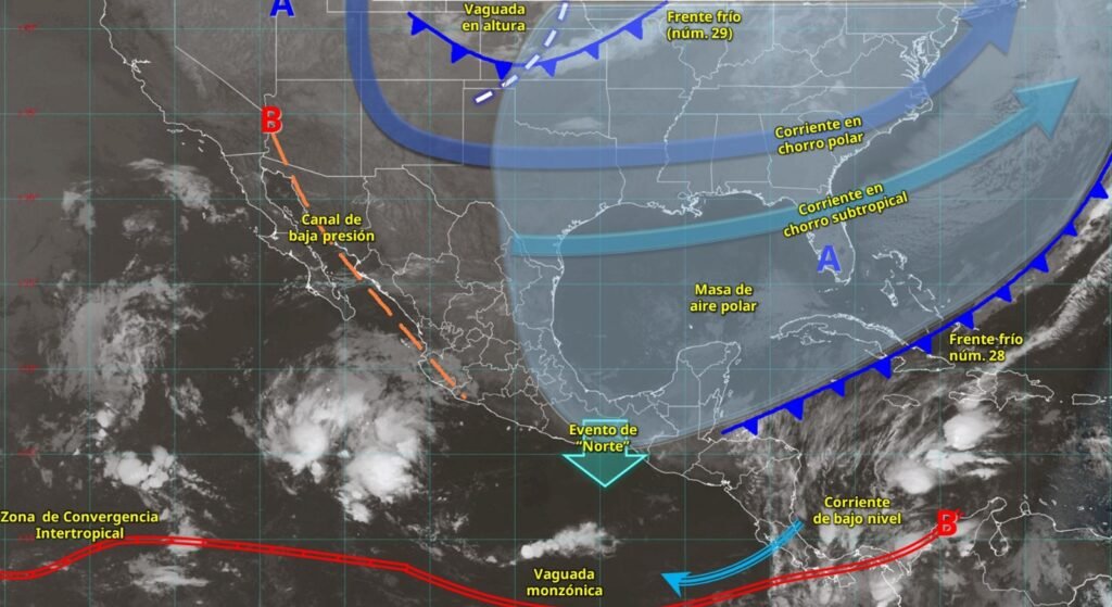 Durante la noche de ese día se espera un nuevo evento de “Norte” en Tamaulipas y Veracruz, extendiéndose hacia el Istmo y Golfo de Tehuantepec.