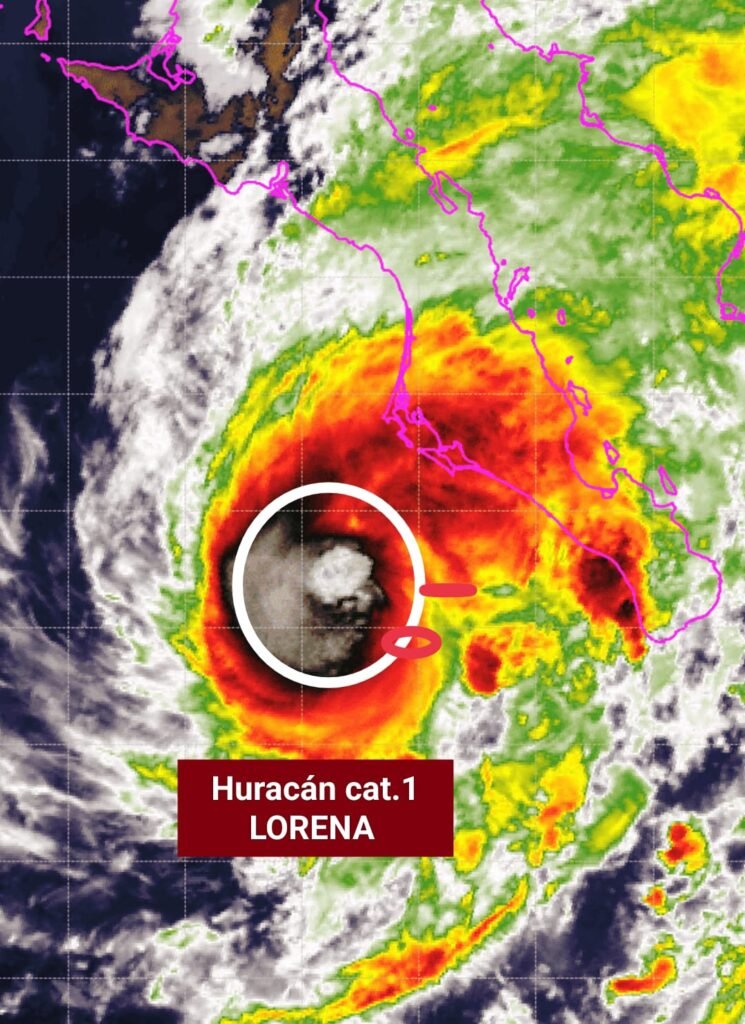 El centro del huracán Lorena, aún como categoría 1 se localizó a 200 kilómetros (km) al sur/suroeste de Cabo San Lázaro, y a 310 km al oeste de Cabo San Lucas. Lorena presenta una dirección de avance hacia el noroeste (310°) a 19 kilómetros por hora (km/h) con vientos máximos sostenidos de 130 km/h y rachas de 160 km/h.