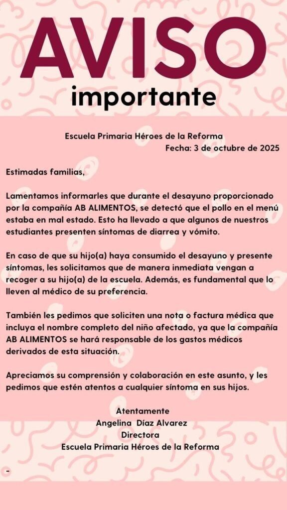 Angelina Días Álvarez, directora de la Escuela Primaria Héroes de la Reforma, ubicada en el ejido Lázaro Cárdenas, fue la primera en alertar de la situación, al informar que, tras consumir un alimento que contenía pollo, varios estudiantes presentaron síntomas de diarrea y vómito.