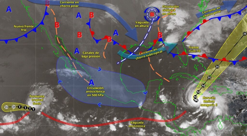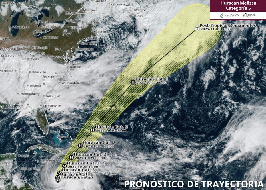 En el océano Atlántico, Melissa, ahora como huracán de categoría 5 en la escala de Saffir-Simpson, se localiza a 230 kilómetros (km) al suroeste de Kingston, Jamaica y a 1,045 km al este-sureste de Cancún , quintana Roo.