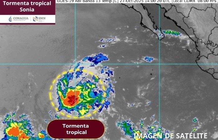 El centro de la tormenta tropical Sonia se localiza a 1,555 km al suroeste de Cabo San Lucas, Baja California Sur, con vientos máximos sostenidos de 75 km/h, rachas de 95 km/h y desplazamiento hacia el oeste a 11 km/h. Debido a su distancia y trayectoria no representa peligro para el territorio mexicano.