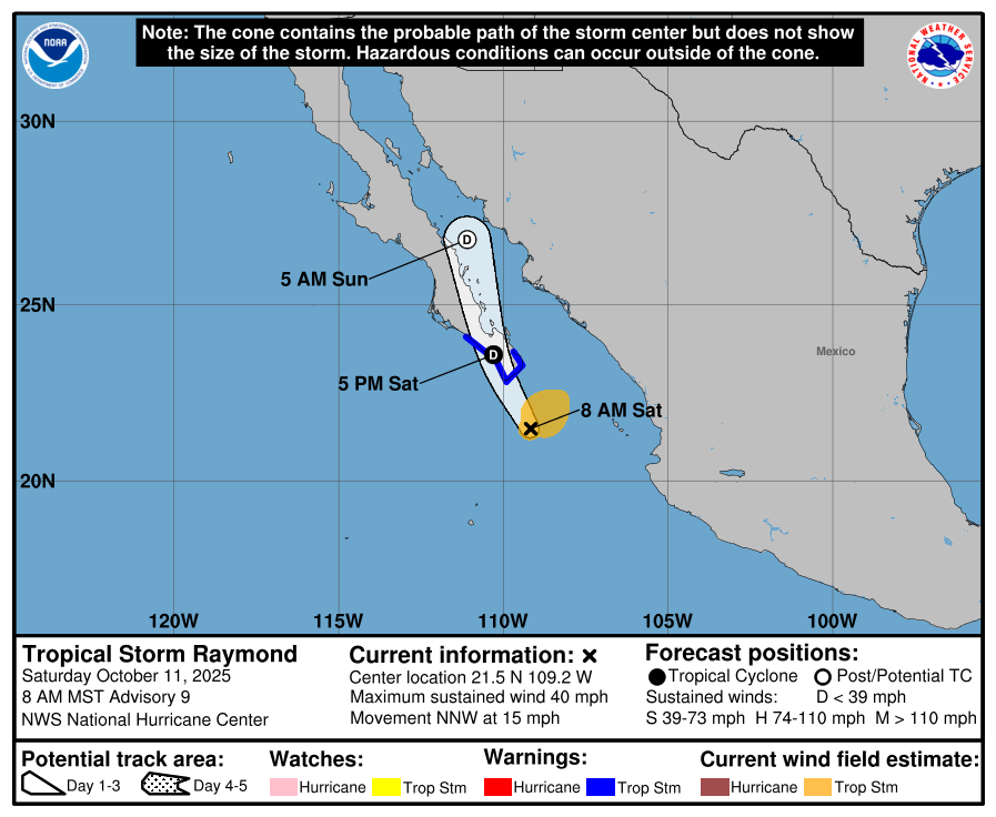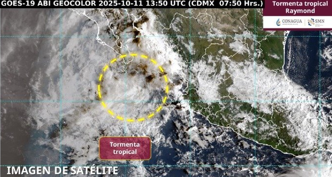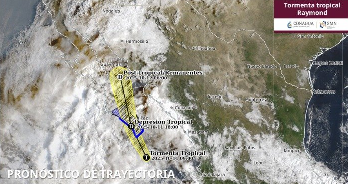 Los modelos de pronóstico indican que, durante las próximas horas, la tormenta tropical Raymond ingresará a tierra en la región sur de Baja California Sur, como posible depresión tropical.