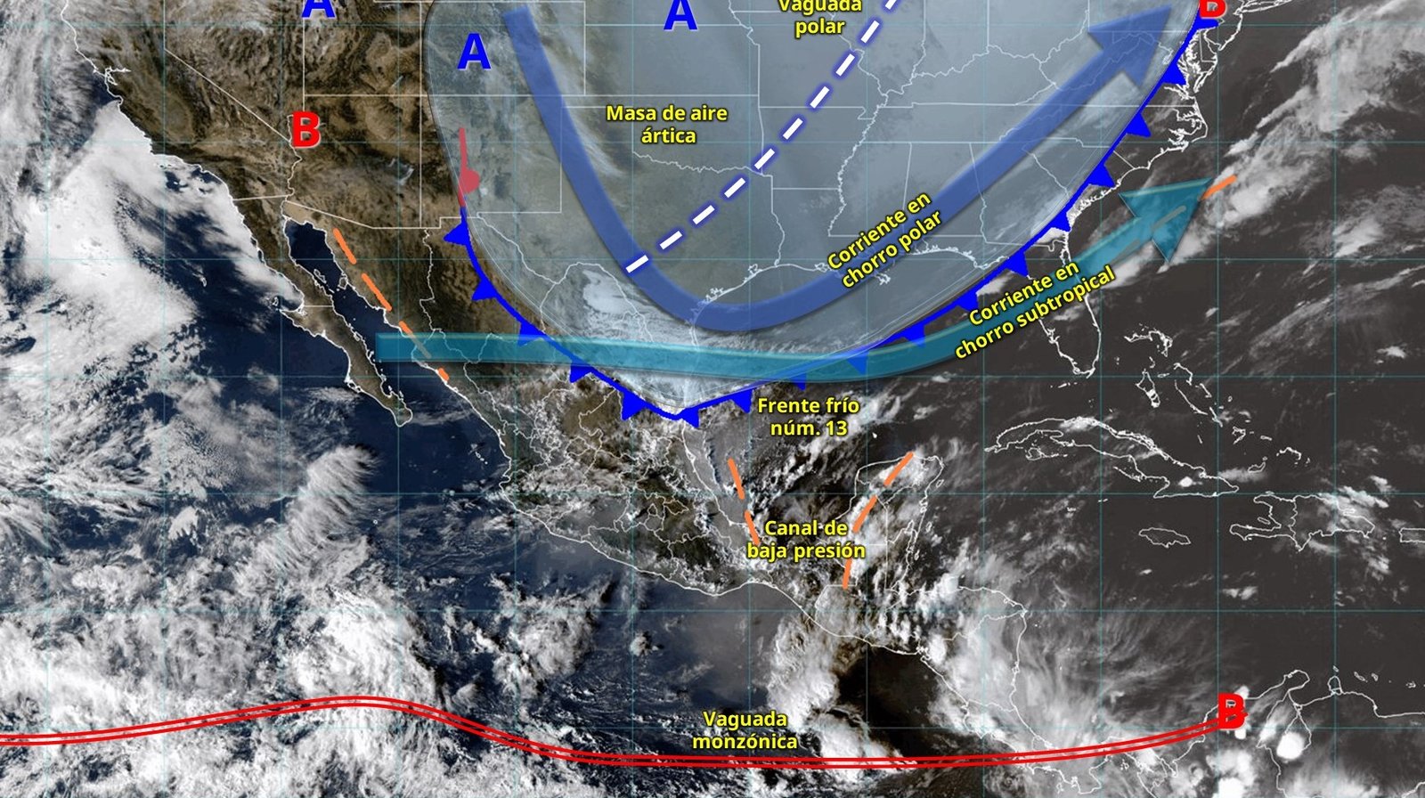 Por otra parte, se informó que el frente frío número 13 traerá lluvias puntuales intensas en Veracruz, Oaxaca, Tabasco y Chiapas. Este clima será generado por la interacción del frente frío con una vaguada polar y con un canal de baja presión.
