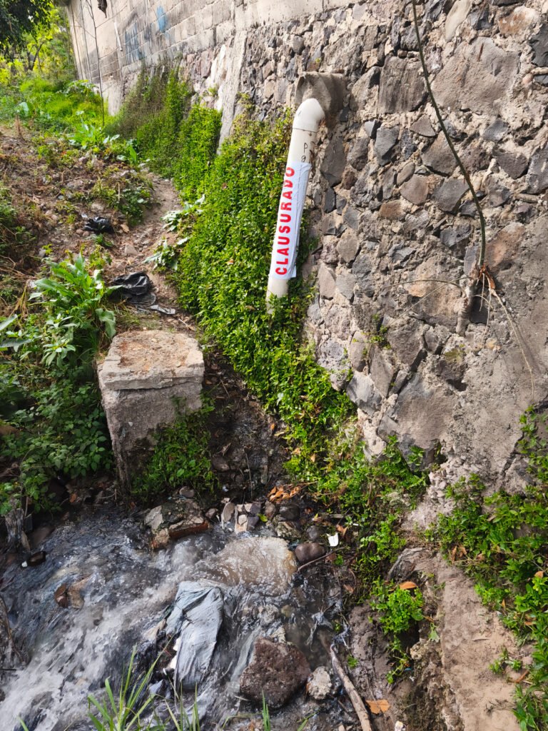 Durante el recorrido se observaron descargas con variaciones visibles de coloración, incluyendo tonalidades negras, rosadas y moradas, mismas que son consistentes con aportaciones de agua de la industria textil sin tratamiento apropiado.