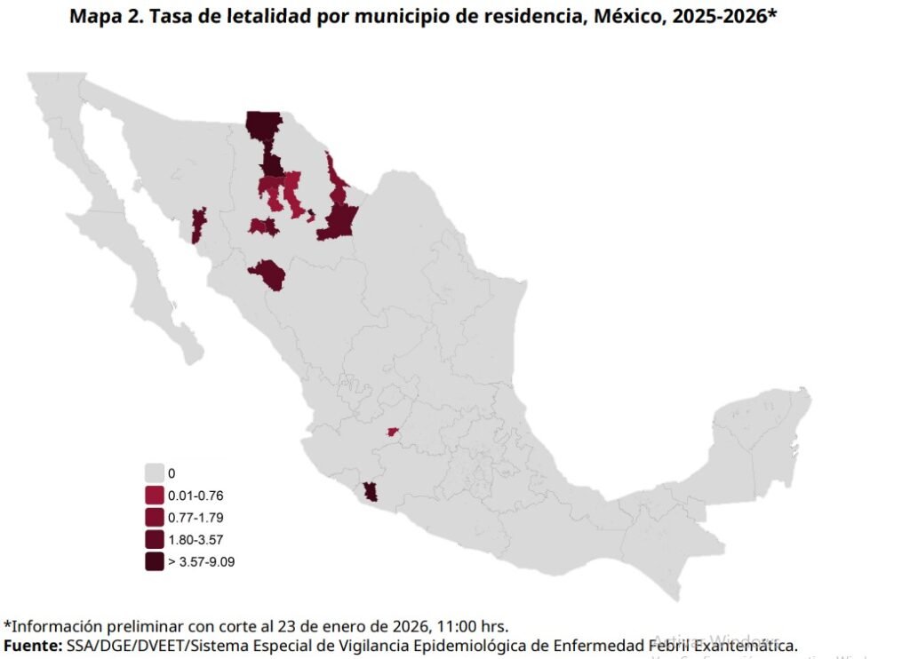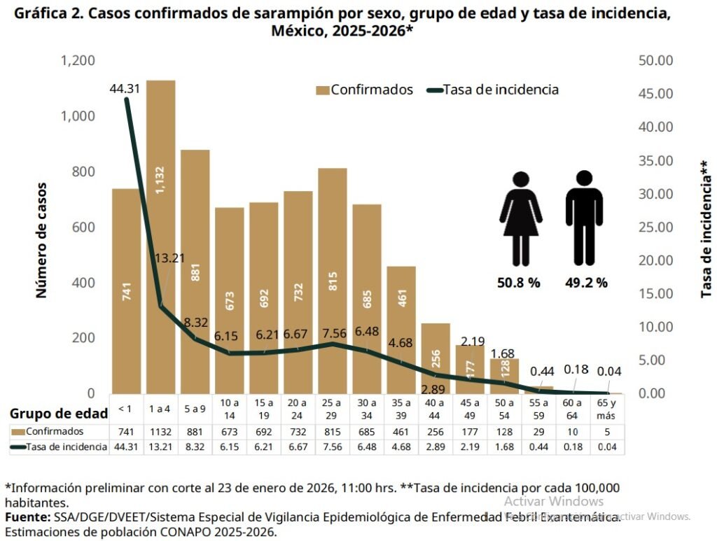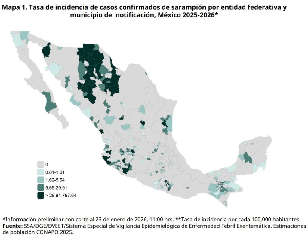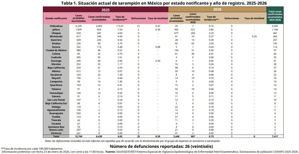 En su último reporte de la situación epidemiológica por sarampión en México, con fecha del 23 de enero de 2026, la Secretaría de Salud confirmó 25 muerte por este virus en 2025 y una en lo que va de este año.