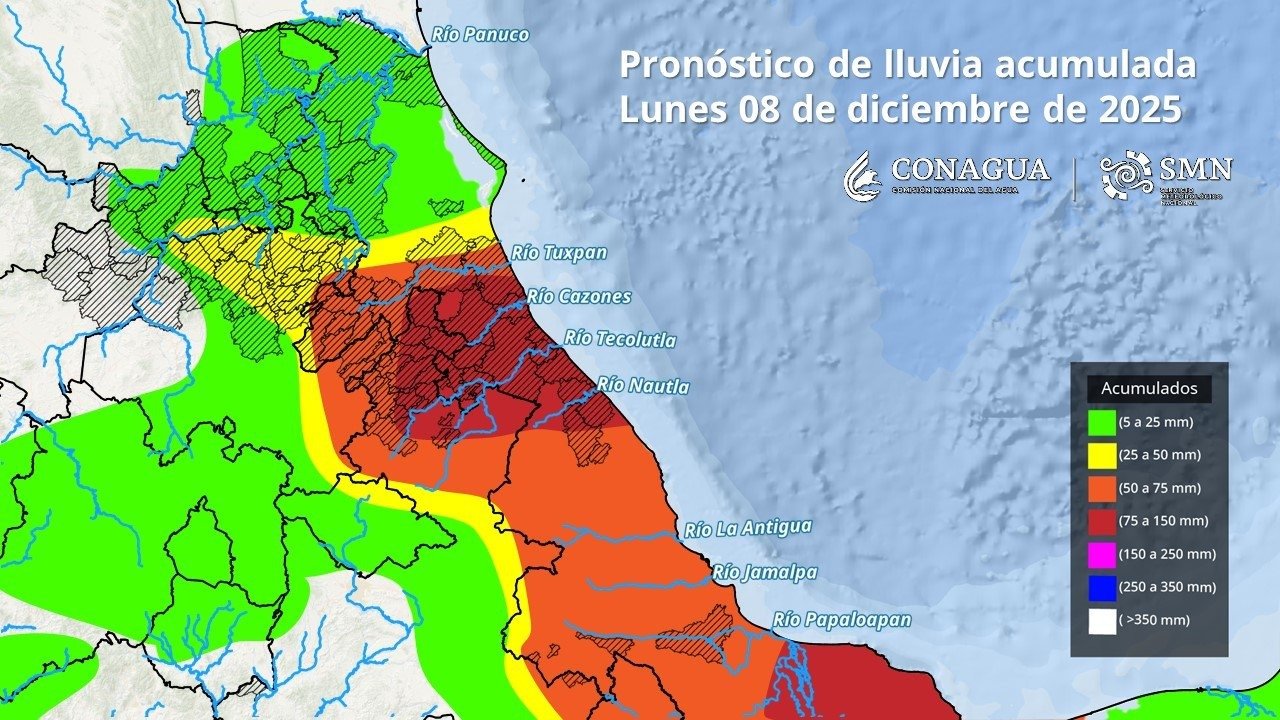 El Servicio Meteorológico Nacional (SMN) alertó de precipitaciones pluviales de (de 75 a 150 milímetros [mm]) en el norte y este de Oaxaca y de Chiapas, oeste, este y sur de Tabasco, Sierra Norte y Sierra Nororiental de Puebla y las regiones Huasteca Baja, Totonaca, Nautla y Olmeca de Veracruz.