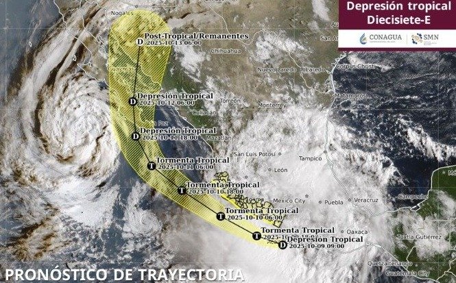 Mientras tanto, en el océano Pacífico se formó la depresión tropical Diecisiete-E, la cual presenta 90% de probabilidad para desarrollo ciclónico en 48 horas; su centro se localiza a 110 km al sur de Técpan de Galeana, Guerrero, y a 185 km al sur-sureste de Zihuatanejo, Guerrero.
