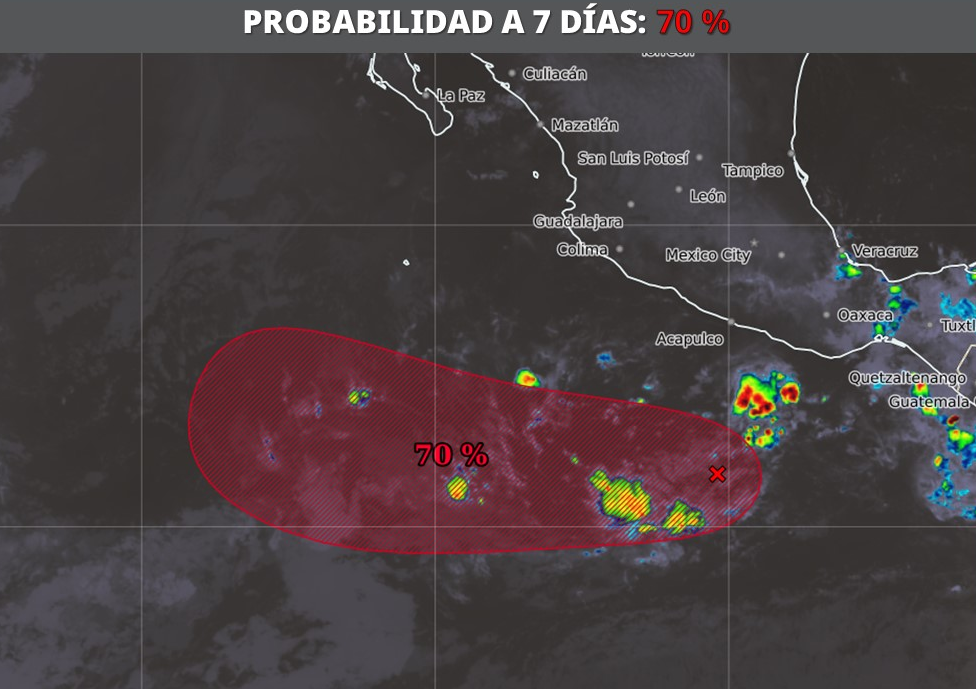 En el océano Pacífico, una zona de baja presión que se localiza al sur de Guerrero mantiene 20% de probabilidad para desarrollo ciclónico en 48 horas y 70% en siete días.