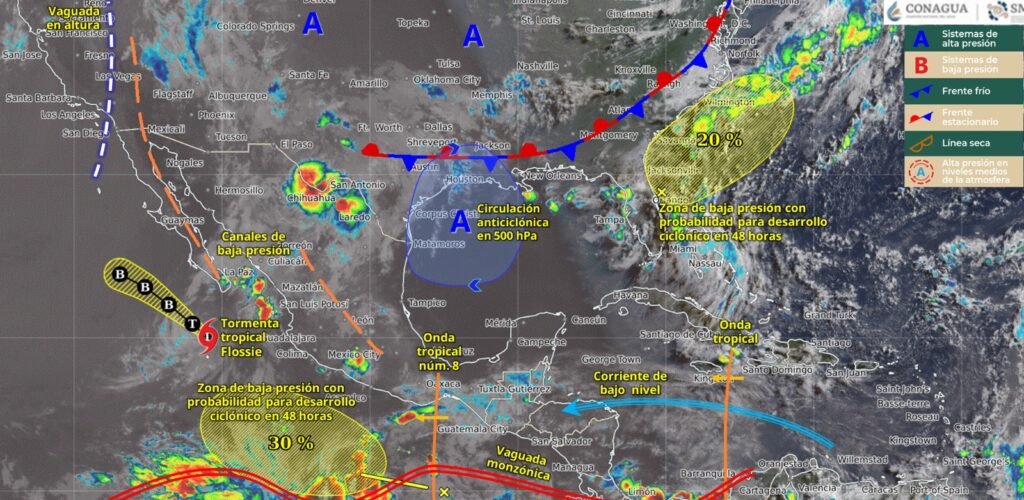 Este día, la tormenta tropical Flossie continuará debilitándose al suroeste de la península de Baja California, pero su circulación y bandas nubosas ocasionarán chubascos, rachas de viento de 40 a 60 km/h y oleaje de 2.5 a 3.5 metros de altura en la costa sur de Baja California Sur.