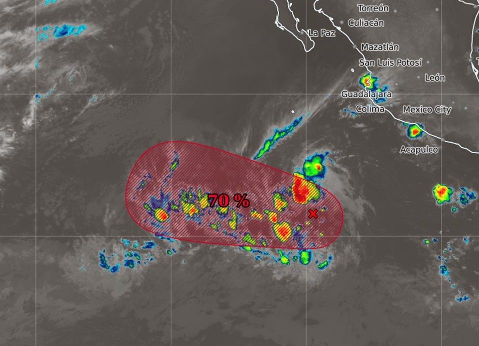 Respecto a la zona de baja presión al suroeste de las costas de Michoacán, esta mantiene 40% de probabilidad para desarrollo ciclónico en 48 horas y 70% en siete días.