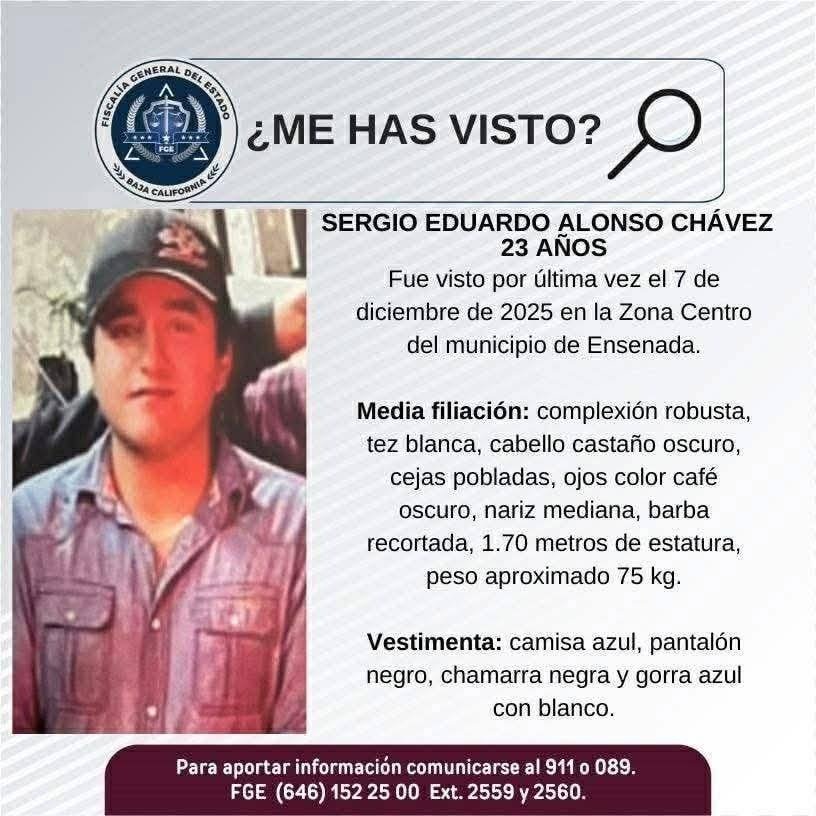 Sergio Eduardo fue visto por última vez a las 16:30 horas del 7 de diciembre de 2025, en la zona centro del municipio de Ensenada, vestía una camisa azul, pantalón negro, chamarra negra y gorra azul con blanco. A la fecha se desconoce su paradero.