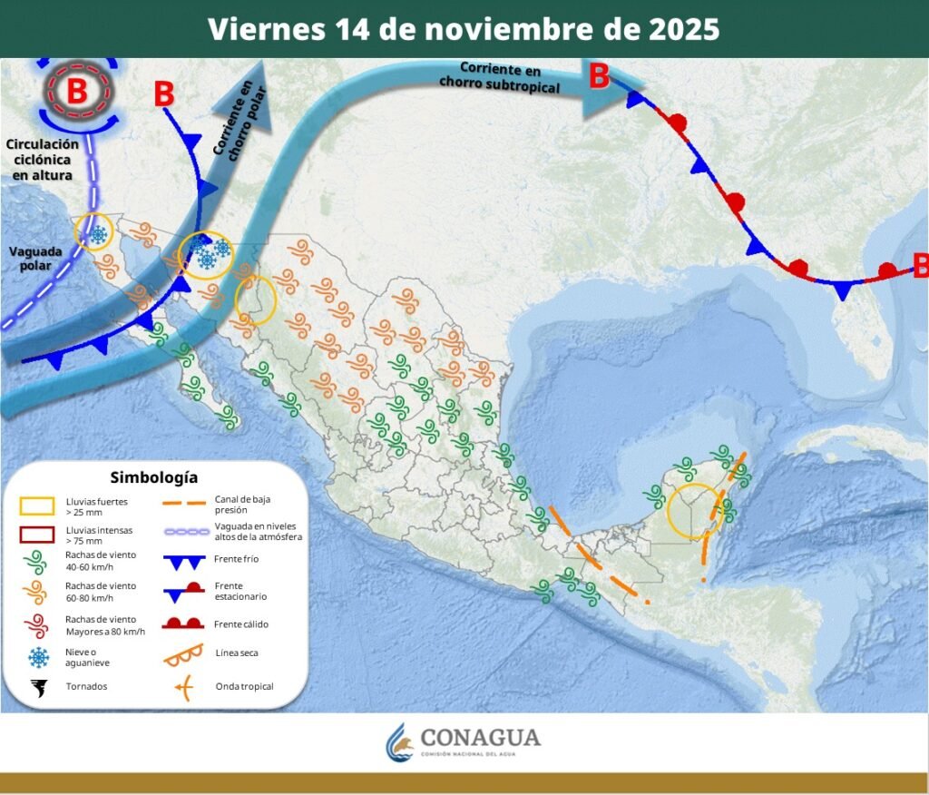 La aproximación e ingreso de un nuevo frente frío al noroeste de México, en interacción con una vaguada polar y una circulación ciclónica en altura, generarán vientos fuertes a muy fuertes con tolvaneras a partir del miércoles 12 de noviembre.