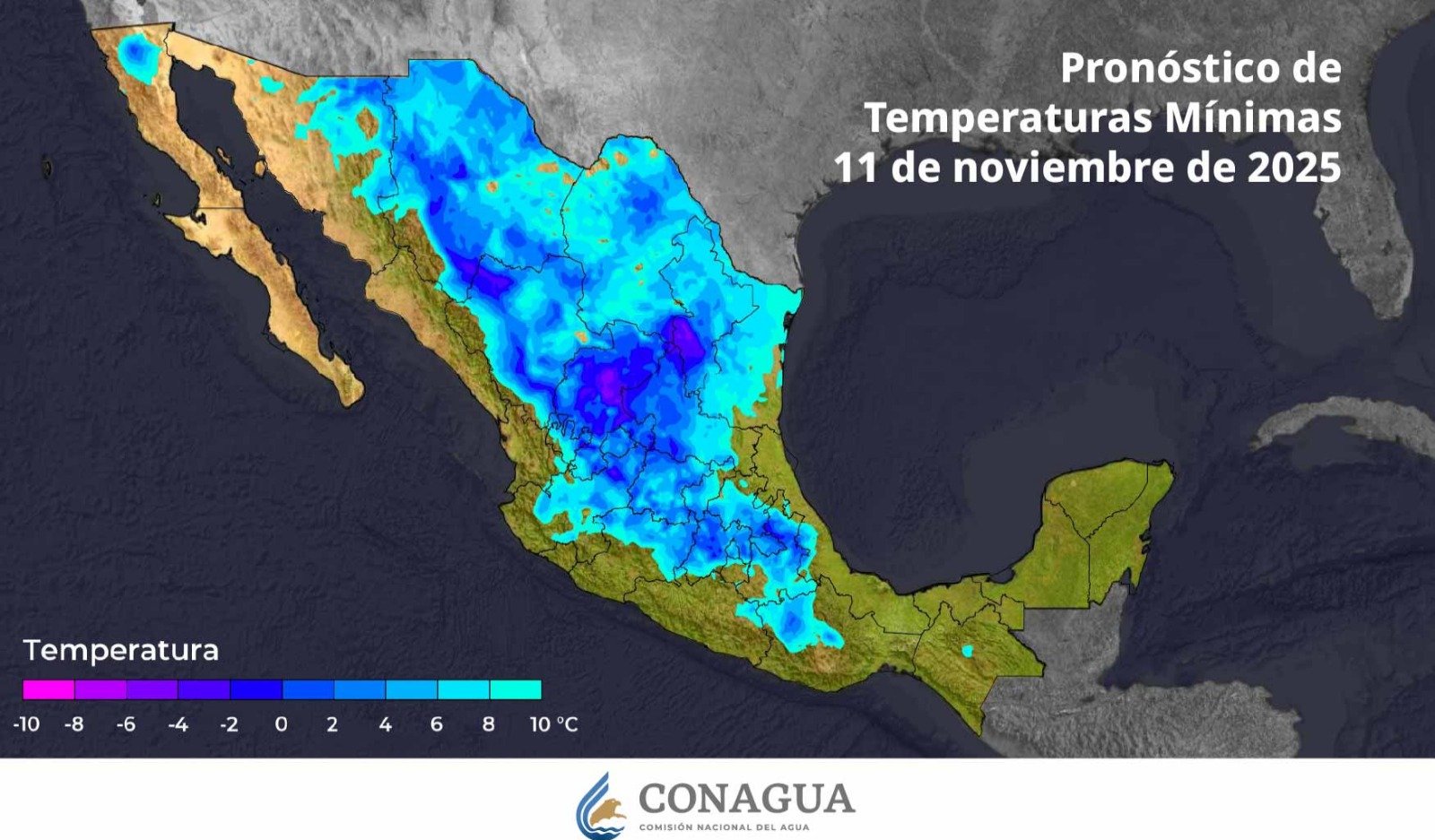 Se prevén temperaturas mínimas de -15 a -10 grados Celsius con heladas en zonas de Durango; de -10 a -5 grados con heladas en zonas altas de Chihuahua; de -5 a 0 grados con heladas en zonas serranas de Baja California, Coahuila (sureste), Nuevo León (suroeste), Zacatecas, San Luis Potosí, Estado de México, Tlaxcala, Puebla y Veracruz.