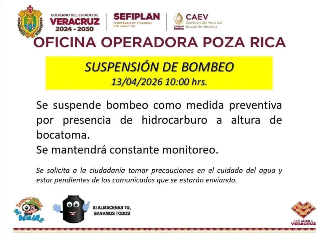 Las lluvias registradas el 13 de abril en Veracruz sacaron a flote la presencia de hidrocarburo y aceite en el arroyo Hueleque, en Poza Rica y en la bocatoma de Coatzintla, lo que obligó a suspender el bombeo de agua, mientras Petróleos Mexicanos (Pemex) activó un operativo de limpieza y monitoreo.