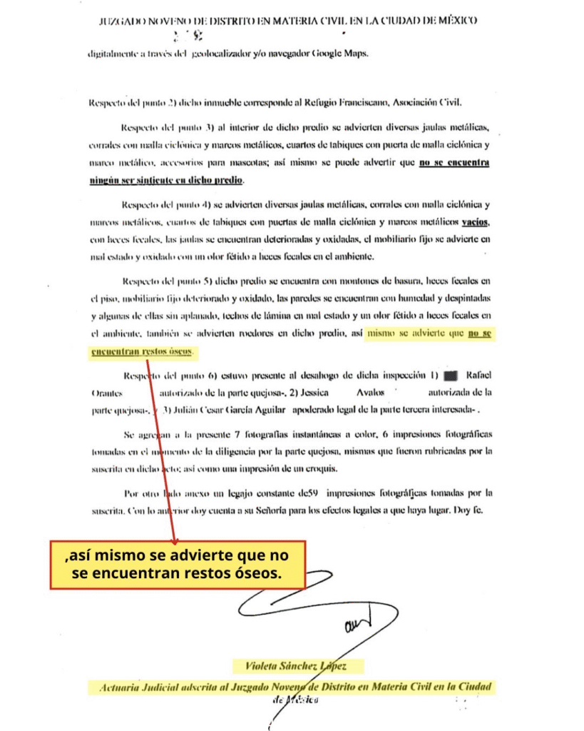Previo a la movilización en su apoyo, el Refugio Franciscano A.C., compartió una acta de inspección en la que el Poder Judicial de la Federación determinó que en el predio en donde se asentaba el albergue de esta organización civil, no se localizaron restos óseos, como lo habían señalado las autoridades de la Ciudad de México.