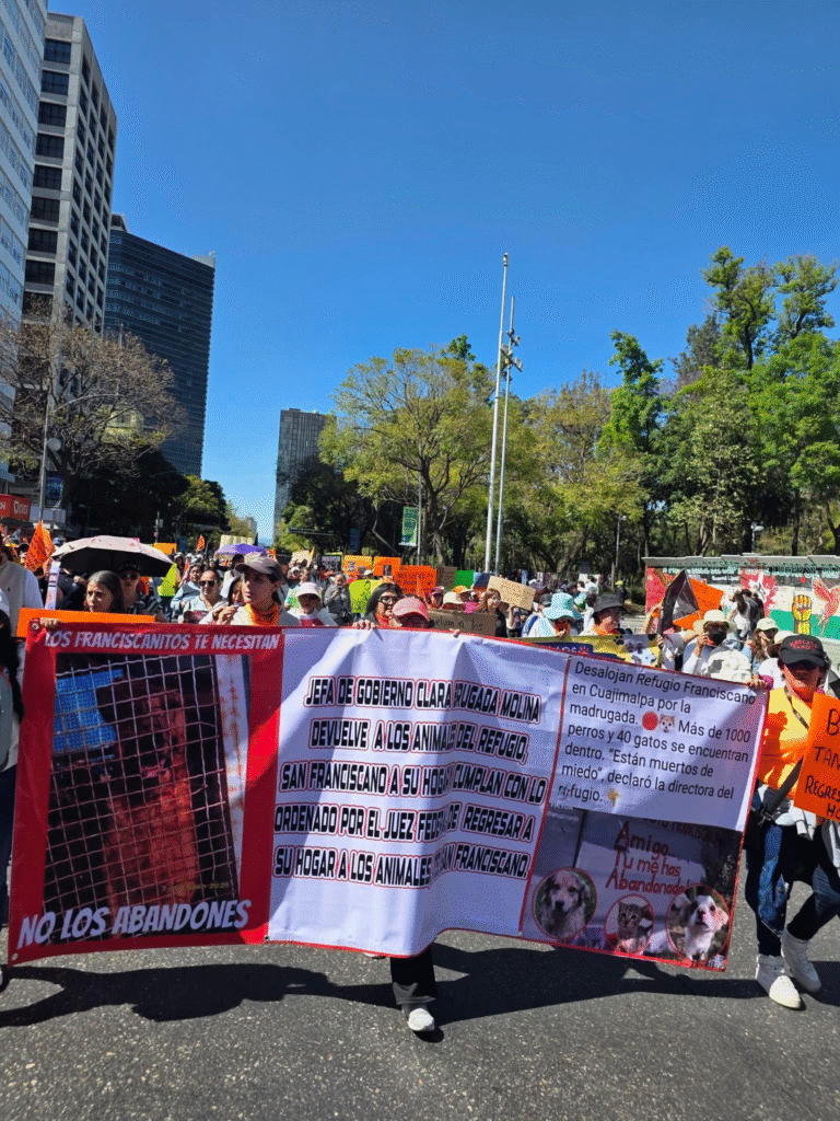 Al grito de “No fue rescate, fue despojo”, animalistas marcharon hoy en la Ciudad de México para reclamar al gobierno de Clara Brugada por el desalojo de más de 900 perros y gatos del Refugio Franciscano y exigirle que cumpla con las resoluciones judiciales sobre el caso.