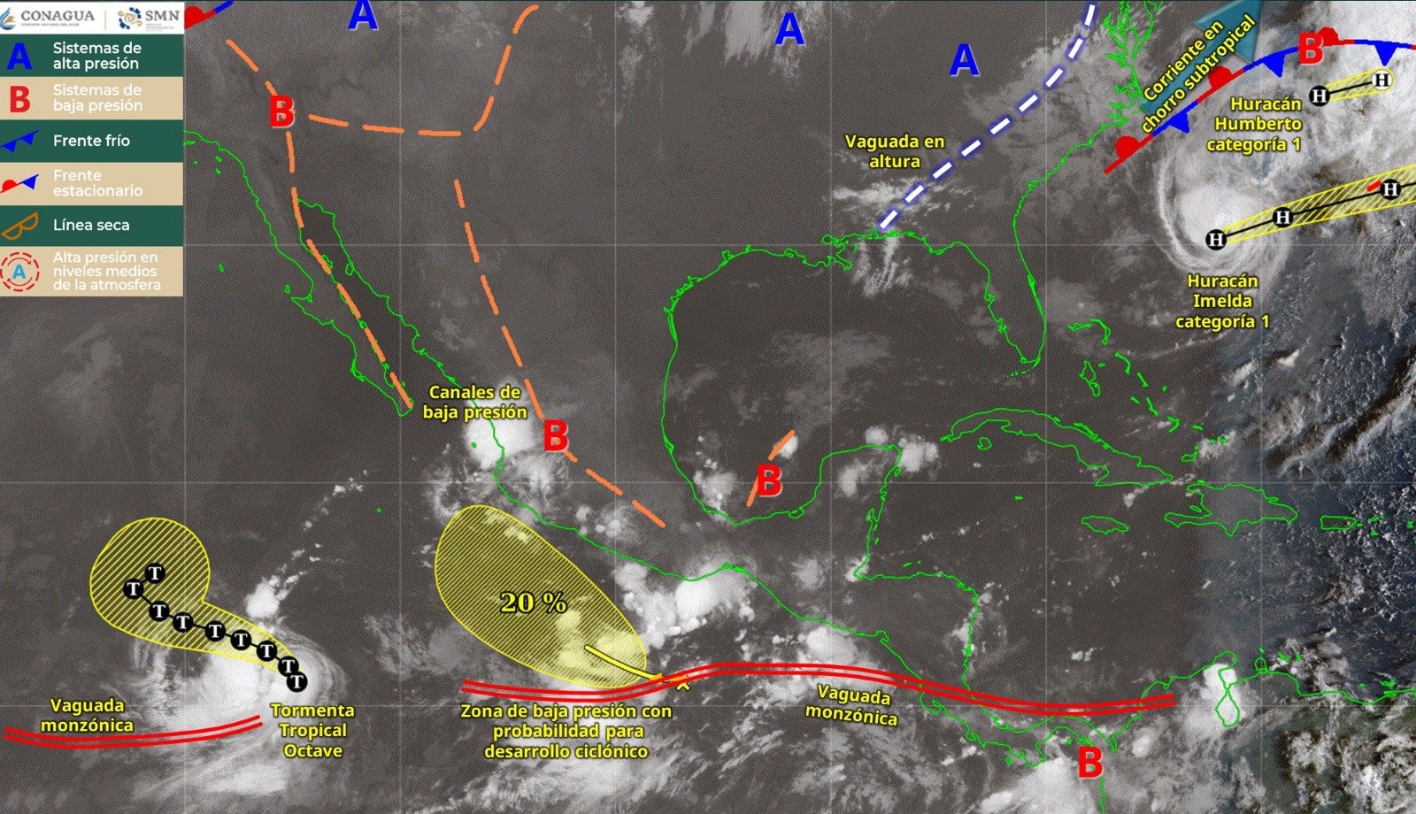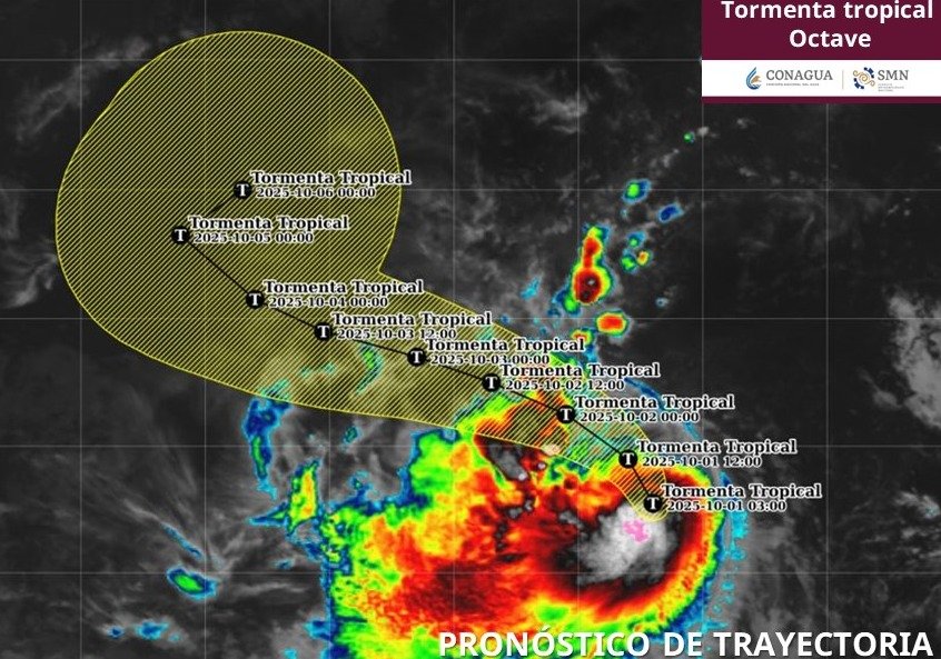 Por su parte, el centro de la tormenta tropical Octave se localizó a 1,410 kilómetros (km) al sur-suroeste de Cabo San Lucas, Baja California Sur, presenta vientos máximos sostenidos de 95 kilómetros por hora (km/h), rachas de 110 km/h y desplazamiento hacia el nor-noroeste a 11 km/h. Debido a su trayectoria no representa peligro para el territorio mexicano.