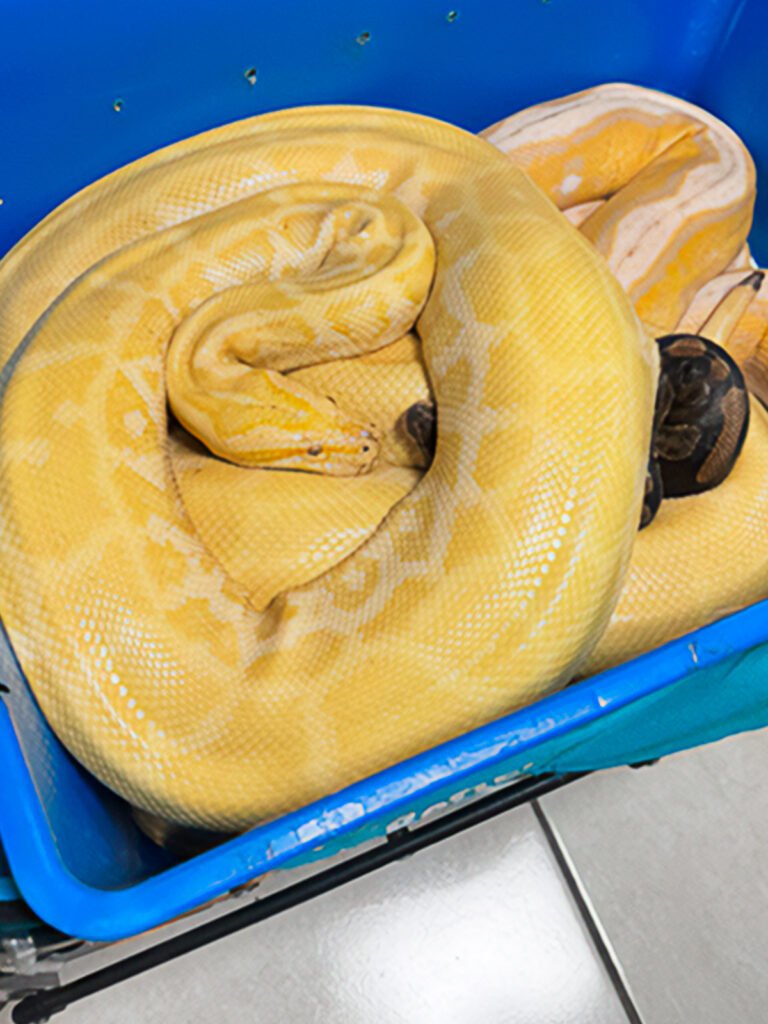 Así, se detectó que la pitón burmes (Python biviattus) presenta mala condición corporal, deshidratación y retención de muda, además de algunas manchas moradas que podrían indicar golpes o septicemia.