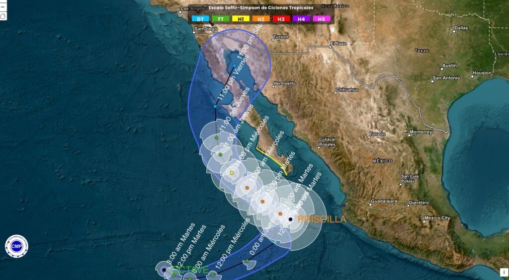 Durante la madrugada de este martes el huracán Priscila se intensificó a categoría 2 en la escala de Saffir-Simpson y se prevé aumente su potencia a huracán 3 en las próximas horas, mientras se desplaza hacia el noroeste a 17 kilómetros por hora (km/h) generando lluvias y fuerte oleaje en cinco estados.