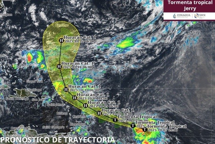En el océano Atlántico, también se formó esta mañana la tormenta tropical Jerry y su centro se localiza a 2,120 km al este-sureste de la Antillas Menores y a 4,640 km al este de las costas de Quintana Roo. Presenta vientos máximos sostenidos de 75 km/h, rachas de 95 km/h y desplazamiento hacia el oeste a 39 km/h.