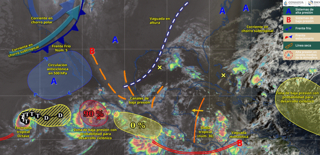 También se prevé la formación de una zona de baja presión frente a las costas de Chiapas, Oaxaca y Guerrero, la cual mantiene 50 % de probabilidad para desarrollo ciclónico en siete días.