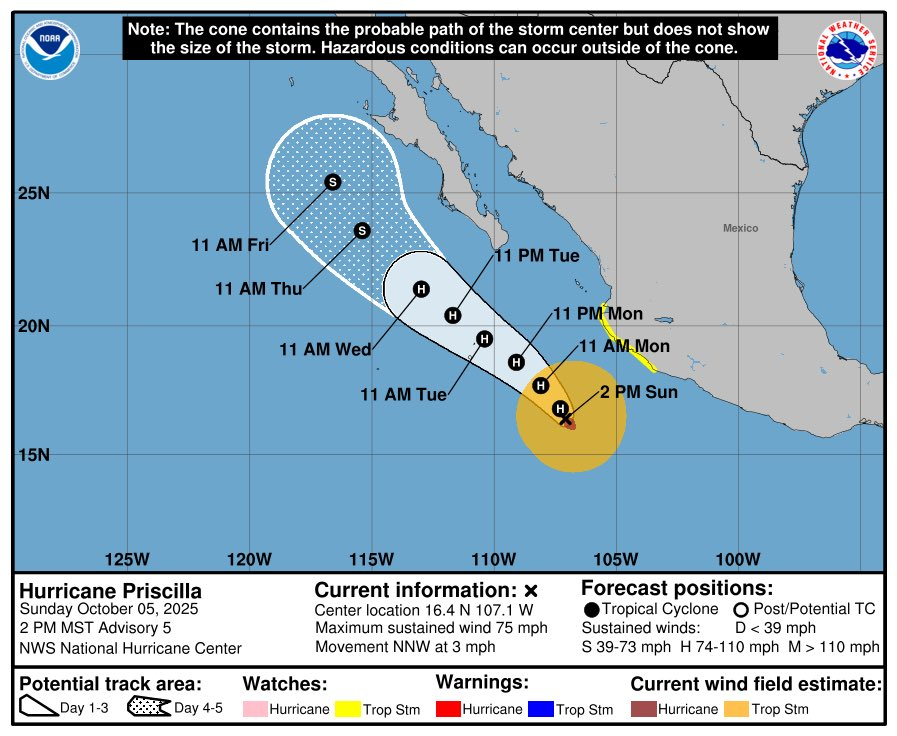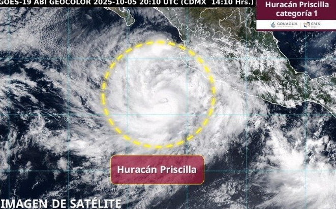 Priscila se intensificó a huracán categoría 1 en la escala de Saffir-Simpson la tarde de este domingo 5 de octubre, en el océano Pacífico, frente a las costas de Jalisco.