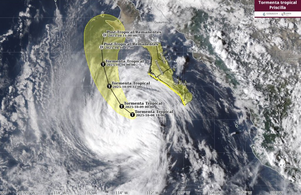 La llegada de un nuevo frente frío y su interacción con la tormenta tropical Priscilla podría afectar la zona costera de Baja California a partir de este jueves y hasta el sábado 11 de octubre, principalmente los municipios de San Felipe y San Quintín, alertó el Comité Estatal de Emergencias de Protección Civil.