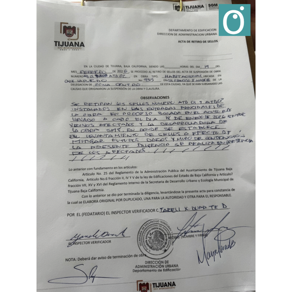 “Se establece el levantamiento de sellos a efecto de mitigar futuros daños”, se lee en el acta firmada y sellada por la Dirección de Desarrollo Urbano (DAU) del municipio de Tijuana. Los sellos serán levantados solo por cuatro meses, periodo durante el cual la empresa deberá levantar el muro de contención en los cuatro lados del predio en donde se erige la torre.