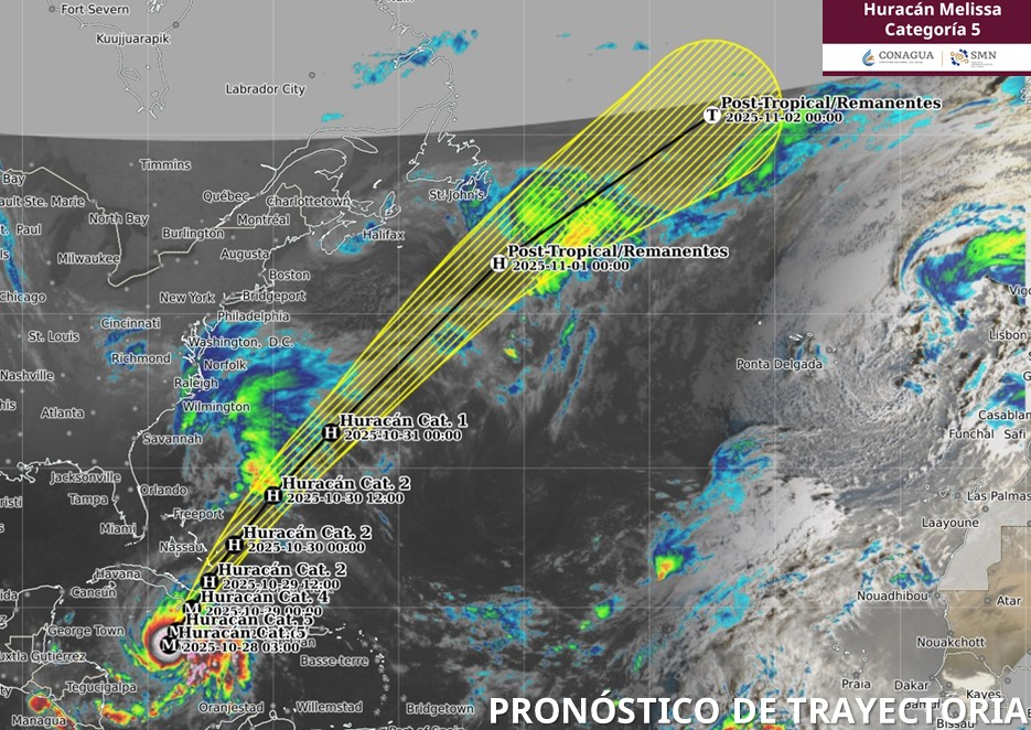 El huracán Melissa de categoría 5 en la escala de Saffir-Simpson, muy próximo a tocar tierra en Jamaica. Debido a su distancia el sistema no representa riesgo para el territorio mexicano.