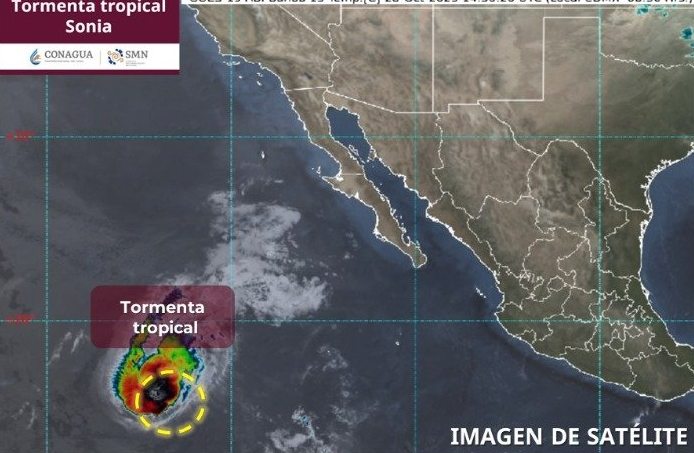 Por su parte, la tormenta tropical Sonia se localizó esta mañana a 1,670 km al oeste-suroeste de Cabo San Lucas, Baja California Sur, presenta vientos máximos sostenidos de 75km/h, rachas de 95 km/h y desplazamiento hacia el oeste-noroeste a 13 km/h. Debido a su distancia y trayectoria no representa riesgo para el territorio mexicano.