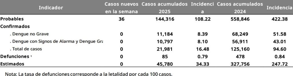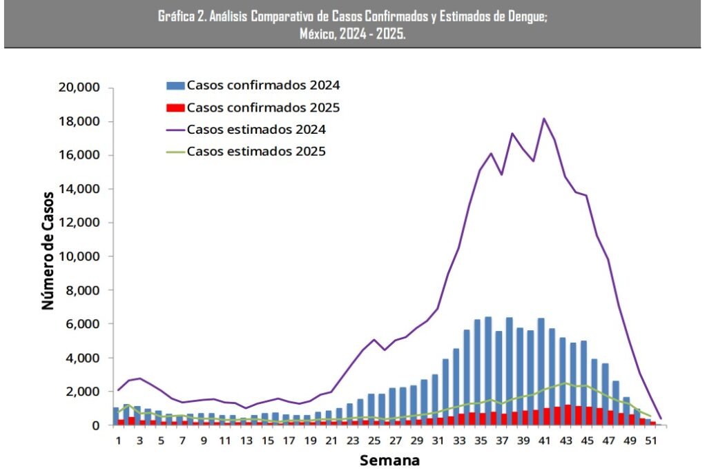 De acuerdo a la estadística anual, México registró una disminución en la incidencia por dengue, con respecto a 2024. Mientras que en 2024 se registró una incidencia del 94.6% con 125,160 casos, en 2025 la incidencia fue de 16.48, con 21,981 casos, según el reporte oficial.