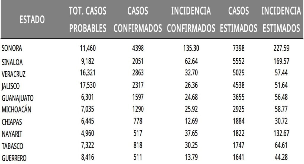 El recuento anual indica que los estados con mayor incidencia de casos confirmados son: Sonora (135.30), Baja California Sur (76.59), Sinaloa (62.64), Nayarit (37.65) y Veracruz (32.70). El 60% de los casos confirmados del país lo concentra: Sonora (4,398), Veracruz (2,863), Jalisco (2,317), Sinaloa (2,051) y Guanajuato (1,597).