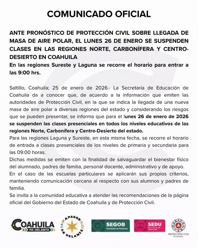 La suspensión se hace efectiva para hoy lunes 26 y para mañana 27 de enero, con la probabilidad de extenderla si las bajas temperaturas prevalecen.