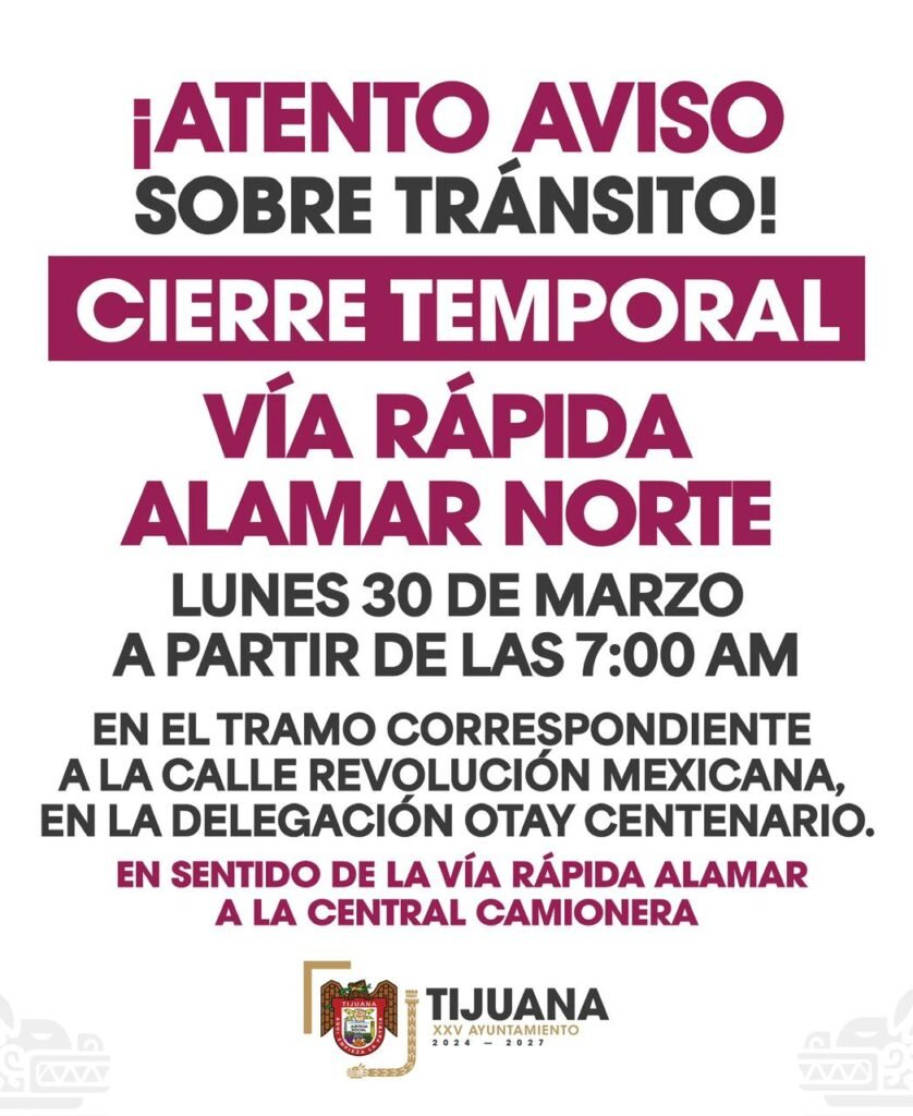 El Gobierno de Tijuana, suspenderá la circulación vehicular temporal de un tramo de la Vía Alamar Norte, a partir de de las 7:00 horas de este lunes 30 de marzo, como parte de las acciones de rehabilitación de la infraestructura pluvial de la zona.